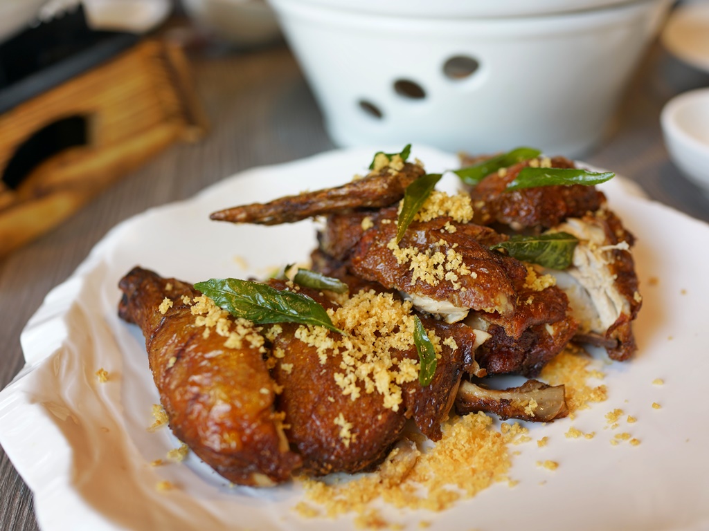 帶皮雞肉先烘過再炸、外皮薄脆,份量大概有半隻雞,雞腿肉很嫩,但吃到某些部位就會覺得稍微乾柴~