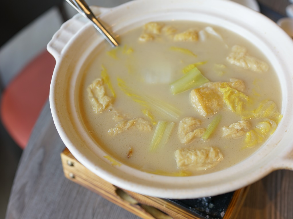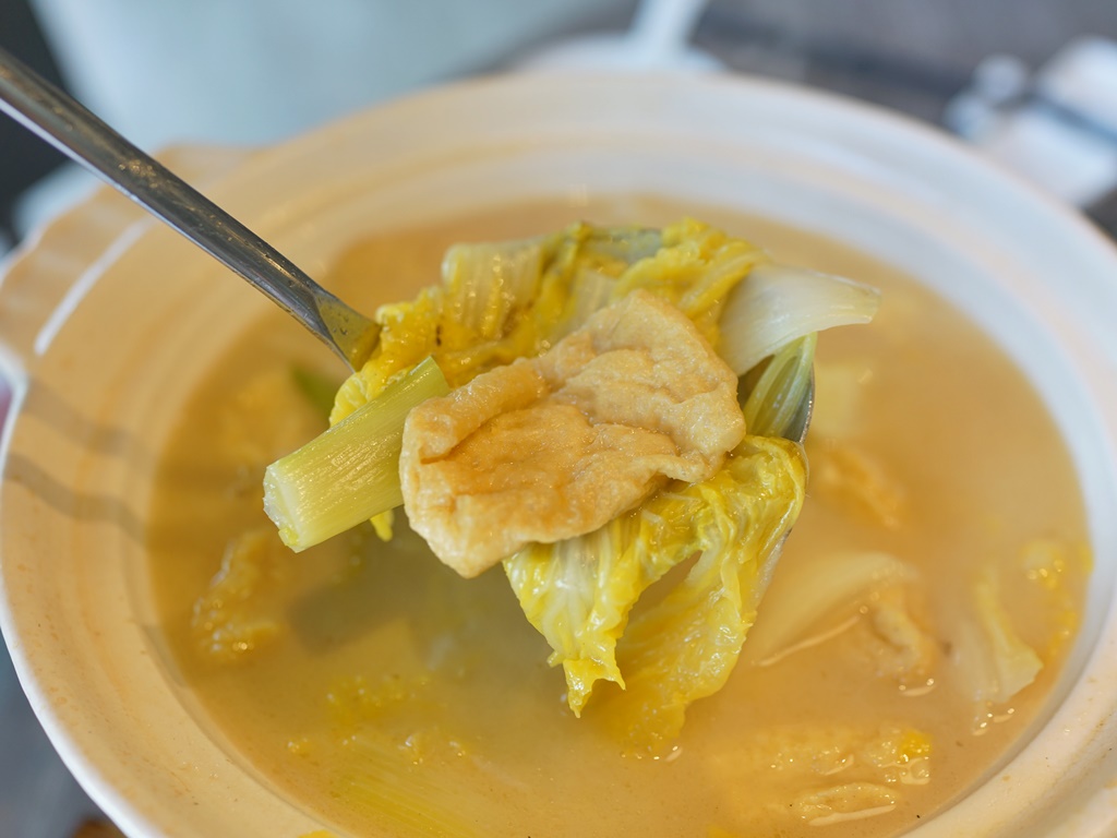 這道是湯品,基底是選用上等老母雞、豬大骨,用文火慢燉8小時以上,加入甜嫩的白菜、特製豆腐、干貝、蝦乾共同熬製而成,滋味很濃郁,特製豆腐就是前面提到店家自製的焦香豆腐,軟軟嫩嫩的很涮嘴!