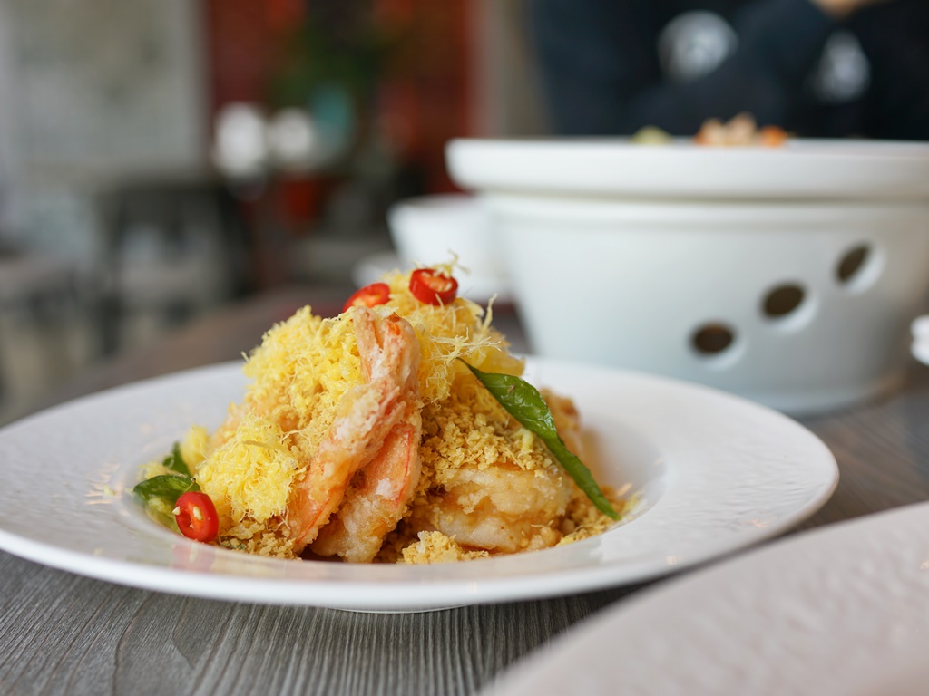 將蝦子去殼再炸,搭配以奶油拌炒的麥片一起入口,鹹中帶甜的滋味相當不錯!