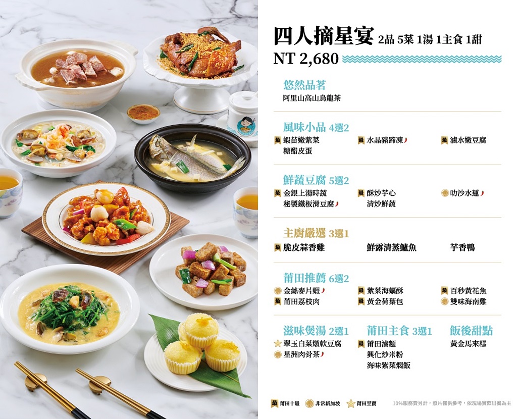 在官網上有非常清晰的莆田菜單可以觀看,我這邊就不一一放上,我們這次吃的是四人摘星宴,共有2品5菜1湯1甜品,內容相當豐盛,另外他們還有雙人、六人和十人套餐,也可以用單點的方式,選擇很多樣化~