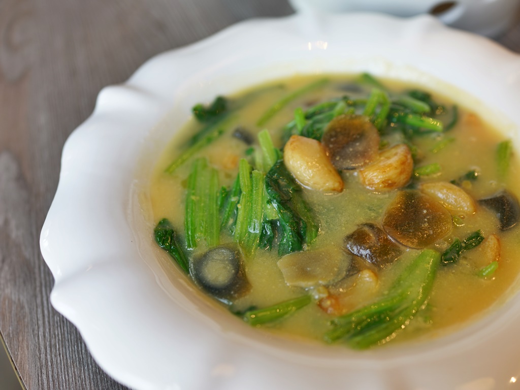 金銀就是皮蛋與鹹蛋,與新鮮菠菜和老母雞高湯結合拌炒,蠻好吃的~