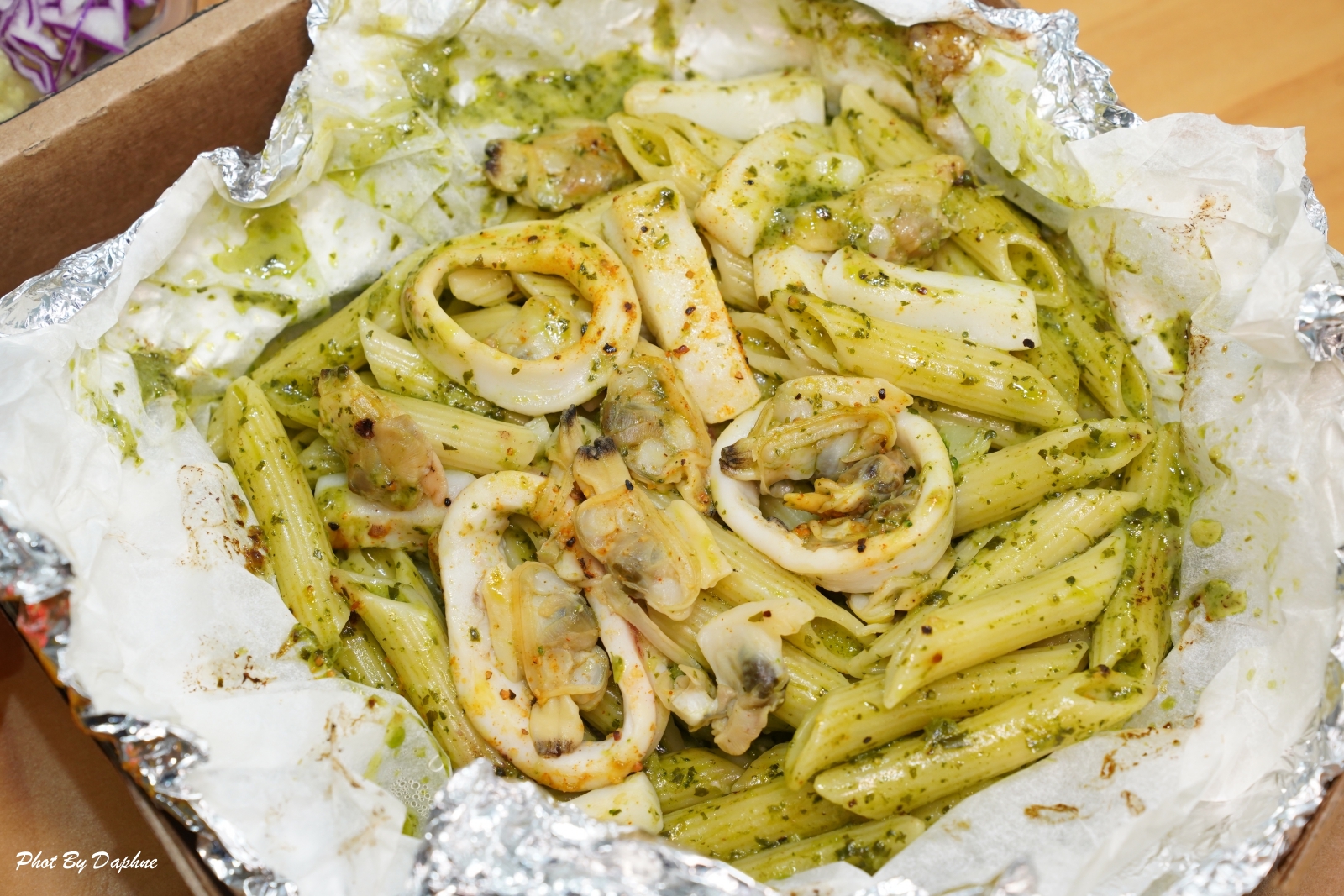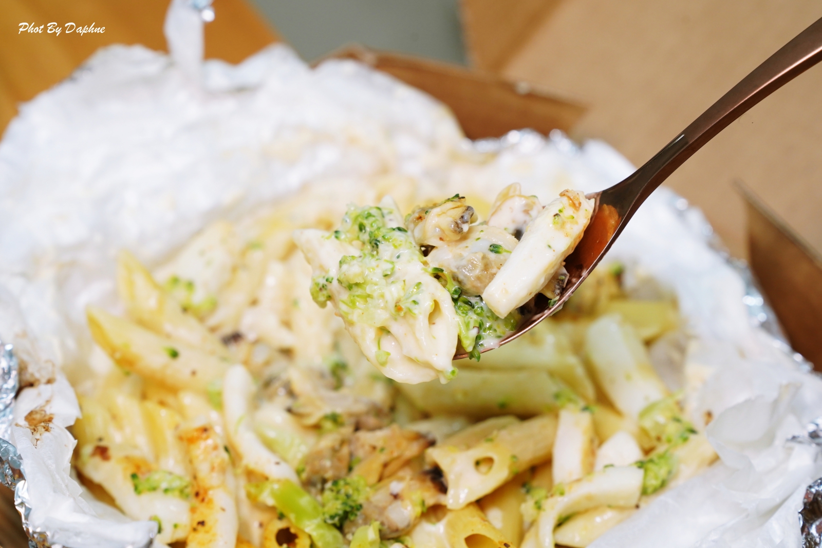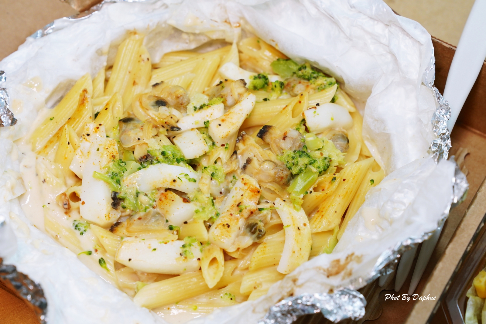 奶油海鮮紙包筆管麵配料有去殼蛤蜊、魷魚條、花椰菜,配色好看、食材新鮮,醬汁調製水準是平常偏愛茄汁、紅醬的 Daphne 心中第一名。