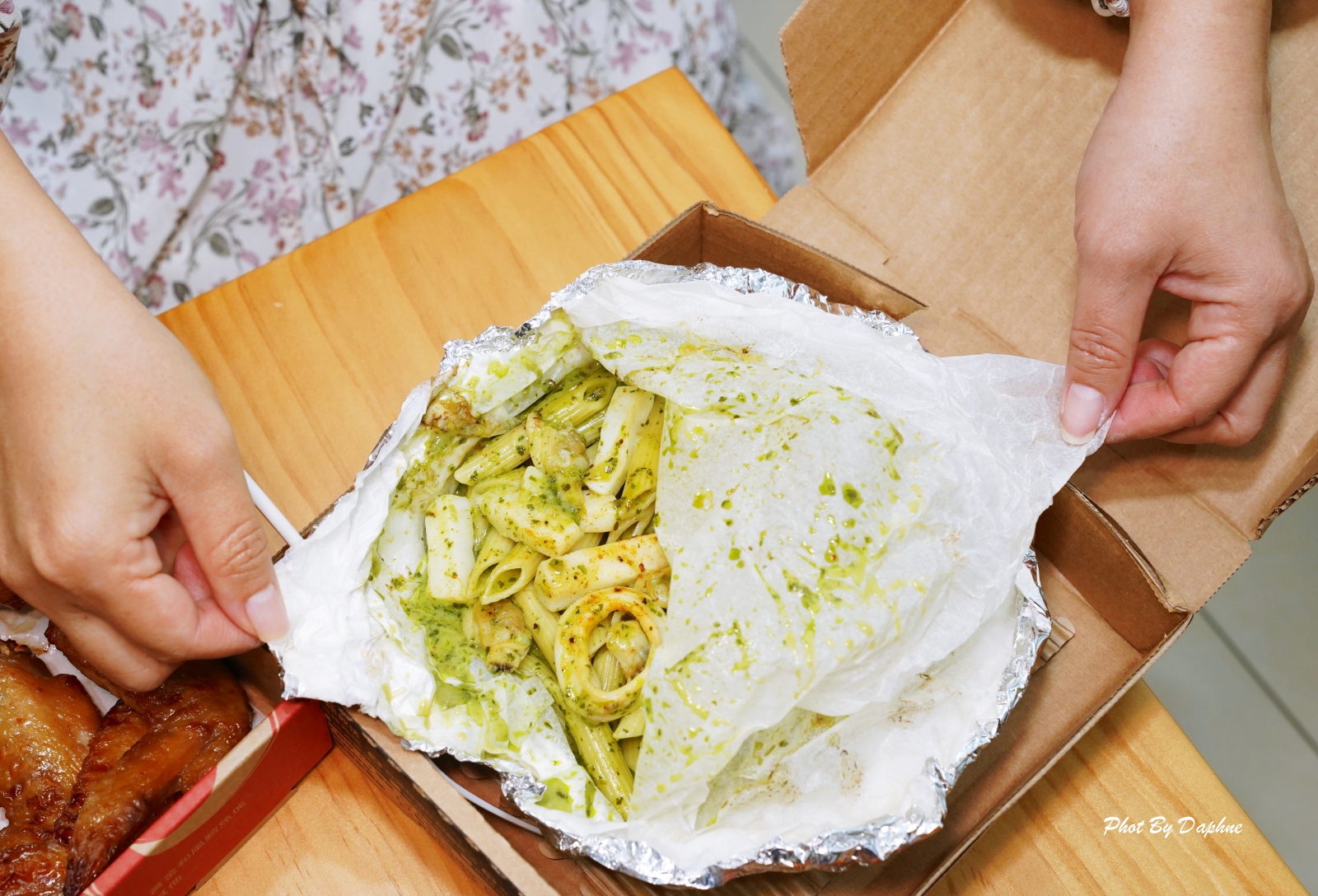 三種口味的海鮮系列紙包筆管麵,使用獨特紙包封烤技術,比一般料理方式更能鎖住食材的溫度與精華,因此由外送人員親送到家後立即食用,口感也跟去餐廳點餐現吃沒有差異。