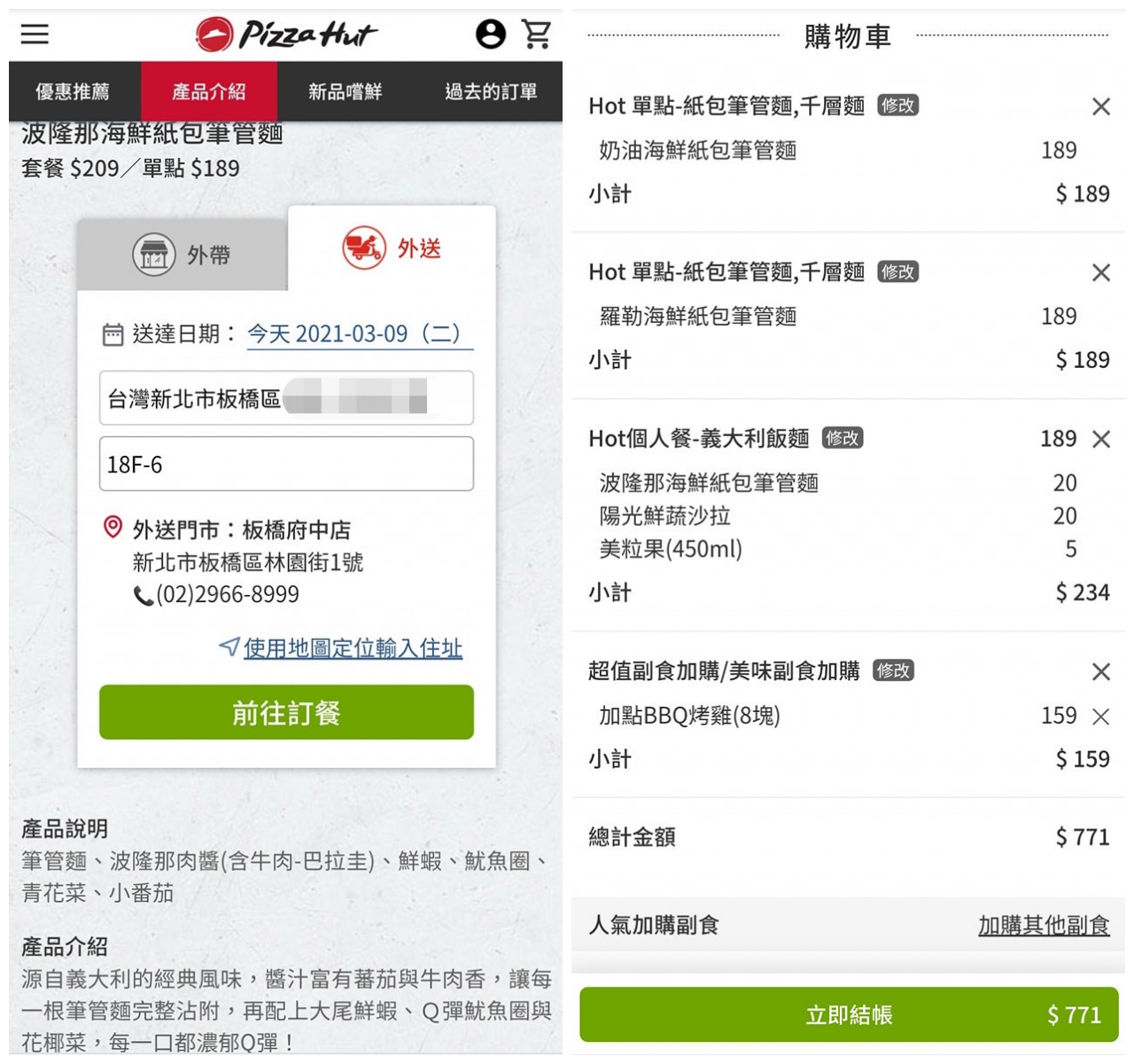 點餐時輸入所在地址,網站會定位尋找最接近的必勝客製作訂單,從訂餐到送餐大約可在一小時內,不過每間分店接單量狀況不一,仍要視店家接單量與尖峰離峰時間狀況而定。