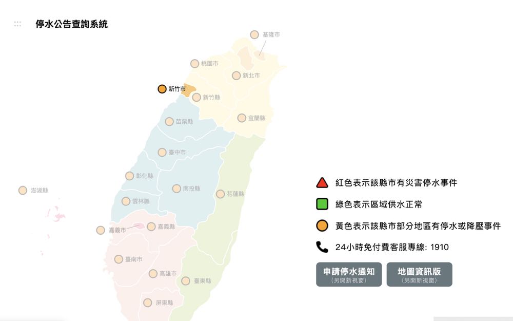 進入後會先看到除了台北市之外的台灣各縣市供水資訊,紅色表示該縣市有災害停水事件、綠色表示該區域供水正常、黃色則表示該縣市部分地區有停水或降壓的情況。