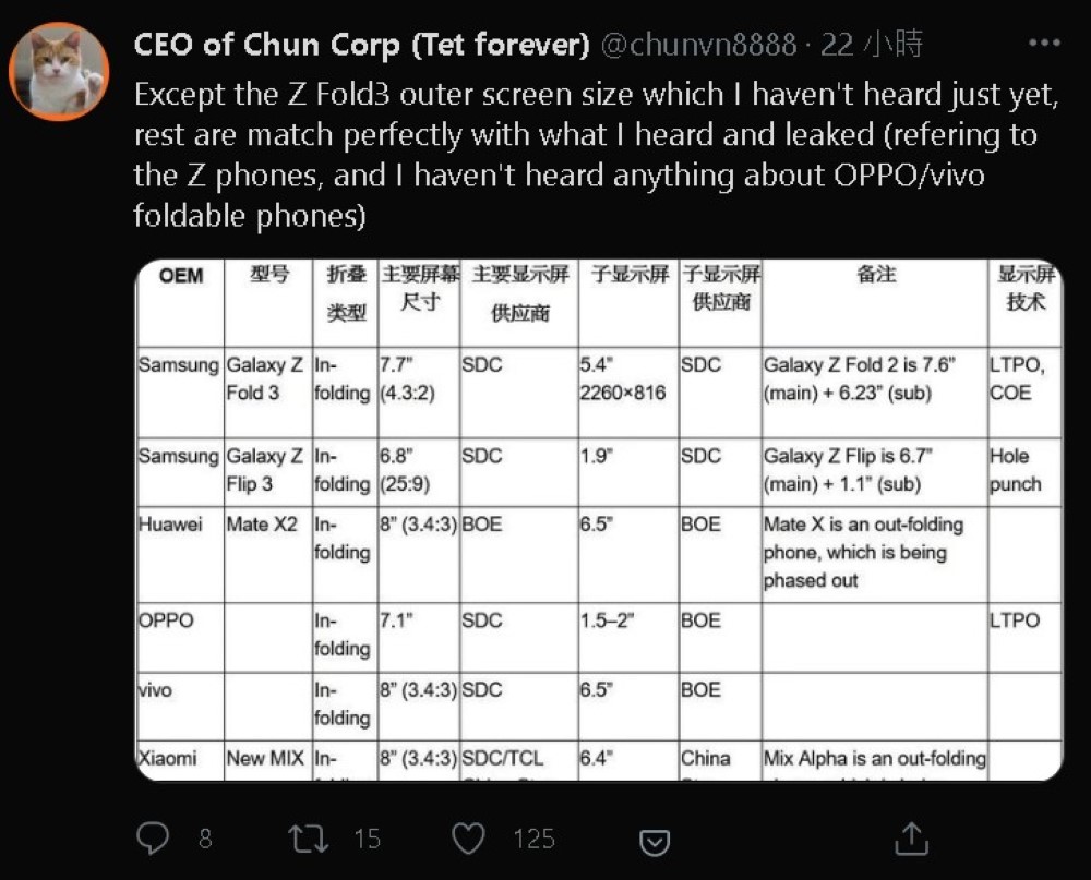 4 月 6 日,有爆料者在推特上公布 Galaxy Z Fold 3、Galaxy Z Flip 3 螢幕規格表,其中 Z Fold 3 的 7.7 吋主螢幕雖然變大了一些,並且加入 LTPO 顯示技術。但封面螢幕卻明顯「縮水」,從 6.2 吋降級至 5.4 吋, 2260 × 816 解析度部分則維持不變。
