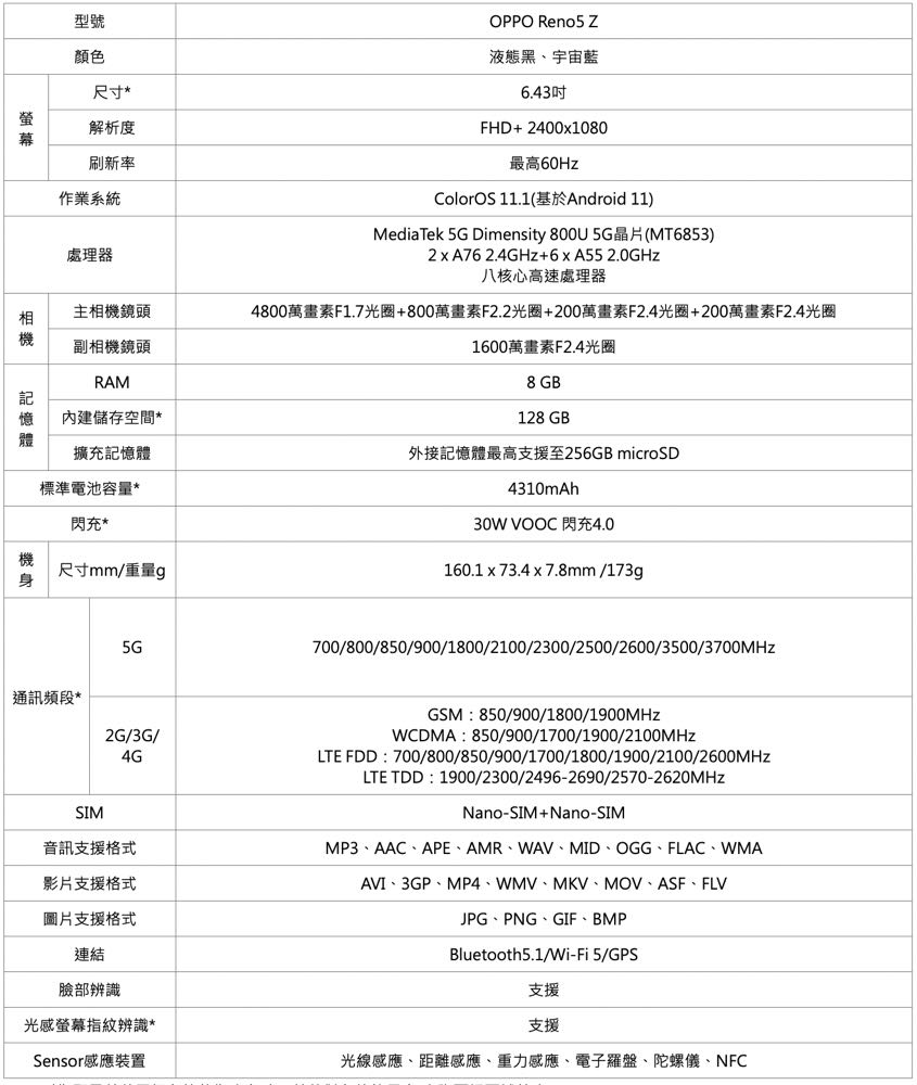 獨家 30W VOOC 閃充4.0,充電 5 分鐘便能持續通話 2.9 小時。上市資訊方面 OPPO Reno5 Z 將於 4 月 9 日起開放預購、4 月 17 日正式上市,預購價為 NT$10,990 元(空機原價 NT$11,990),預購再加碼總價破 8,000 元限量豪禮,帶給喜愛 OPPO 的朋友一個輕巧新選擇!