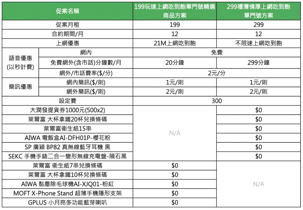 在最近國際紙漿價格飆漲,國內衛生紙售價蠢蠢欲動下,亞太電信為數位門市申辦用戶帶來 4G 199 / 299 的限時方案,約期 12 個月,分別享有 21Mbps/不限速上網吃到飽,網外及市話每月贈送 20 分鐘及 299 分鐘優惠,還會送出衛生紙、AIWA 電飯盒、1000 元大潤發提貨券、AIWA 黏塵除毛球機等多樣商品!!!