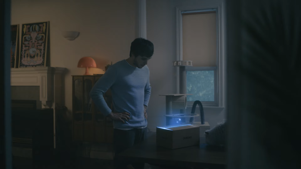 影片中可以看到一名貨運工人將有「Galaxy」標誌的包裹堆放於貨車,當工人將門關上,包裹內釋出的藍色光芒暗示新品蓄勢待發。運送過程中,貨車經過的機器都發生故障,自動販賣機自動吐產品、吹風機瞬間加大風力、車上廣播忽然失靈、整條街車子警鈴大作……最終包裹送達一位男主人的家門口,當男主人開啟包裹時,發出藍色光芒的「蓋子」緩緩掀起。答案很明顯,很有可能是全新的 Galaxy Book。