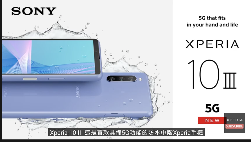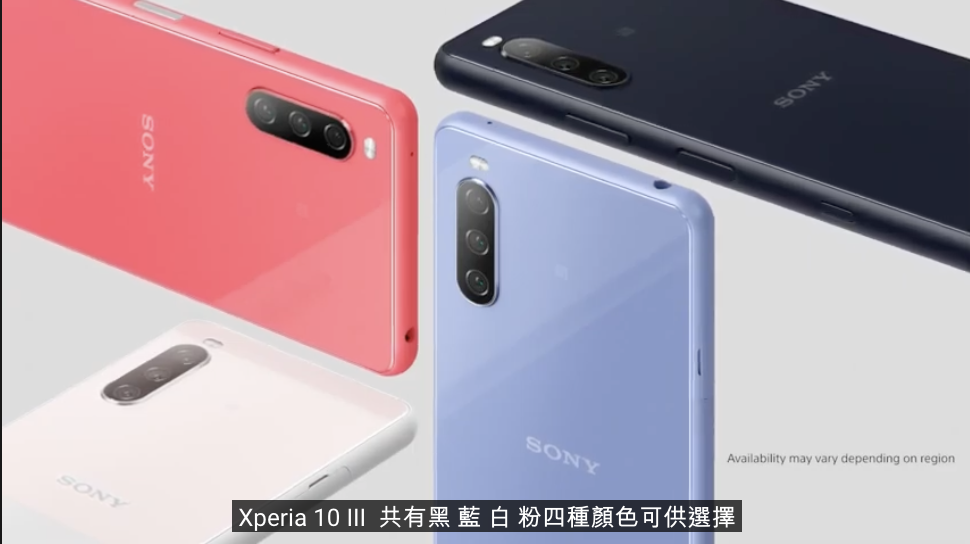最後是中階 Xperia 10 III ,也同樣加入了 5G 的行列,6 吋 OLED 螢幕、高通 S690 處理器、1200 萬畫素主鏡頭與 800 萬畫素超廣角與望遠鏡頭共三鏡頭配置,4500mAh 電池容量,支援指紋辨識與防水,共有黑、白、藍、粉四色。