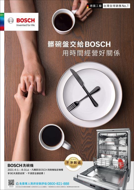 洗碗機全球及台灣銷售第一品牌 BOSCH,領先業界貼心的「不淨則退 90 天滿意保證」及「免費專人到府安裝評估」服務,更是奠定連續在台銷售第一好的成績。以實際體驗獲得消費者信任與肯定,執行至今總計已有近萬人申請「免費專人到府安裝評估」及「不淨則退 90 天滿意保證」,受到消費者熱烈參與及迴響。