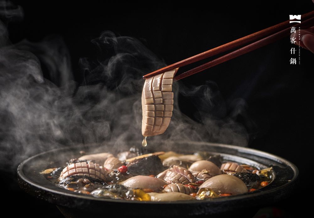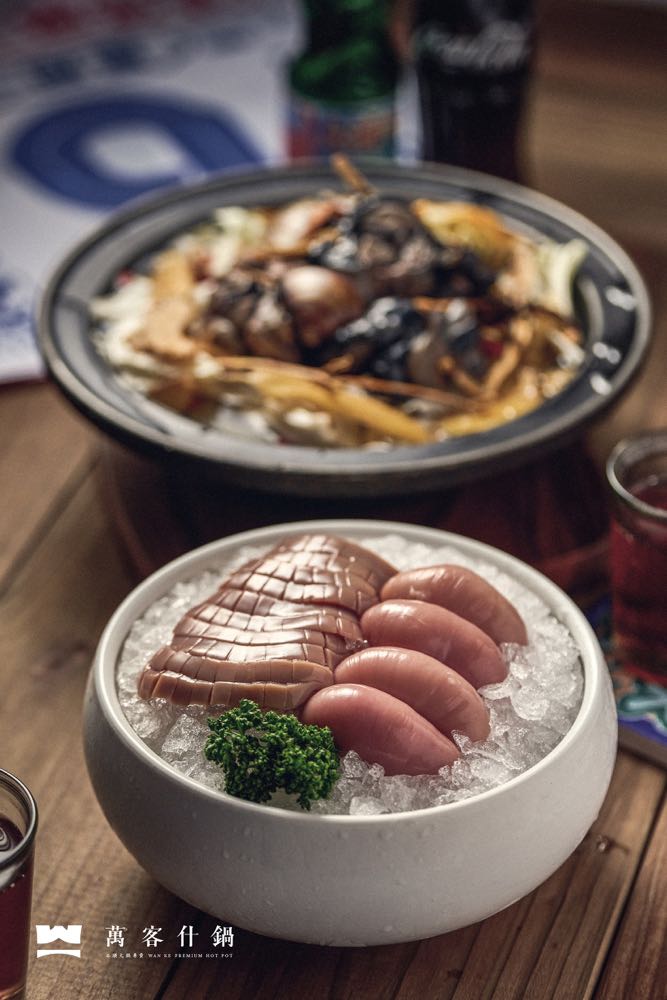 萬客什鍋還推出全新鍋物「燒酒雙腰烏骨雞鍋」以爆炒燒酒雞為湯底,加入經典台菜料理麻油雙腰的靈感,選用新鮮豬腰,粉粉淡紅色質地柔嫩又鮮美,經過廚房巧工處理切花,大火煮滾後入鍋只需煮 30 秒,便能品嘗到脆中帶著鮮嫩,與雞佛入鍋搭配即是俗稱的雙腰,兩者在燒酒雞火鍋中烹煮,雙享受同時也補足了營養,溫補不分季節。