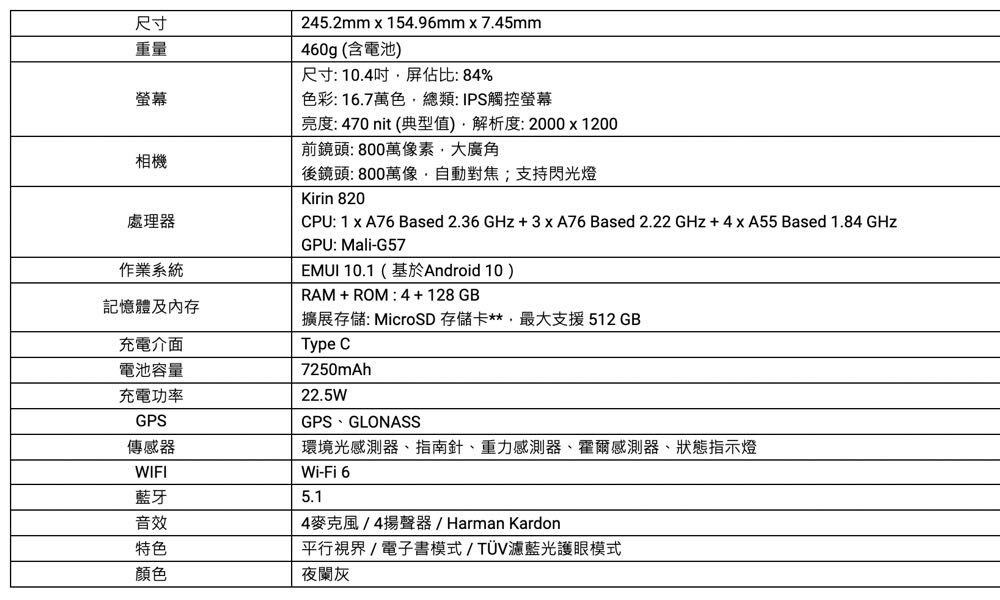 HUAWEI MatePad 規格上有著 10.4 吋 2K 全螢幕、7.9 mm 窄邊框,採用 Kirin 820 處理器、4+128GB 組合配置(可透過擴充記憶卡最高至 512GB、800 萬畫素主鏡頭與 800 萬畫素前鏡頭,7,250mAh 電池容量,22.5W 充電功率。