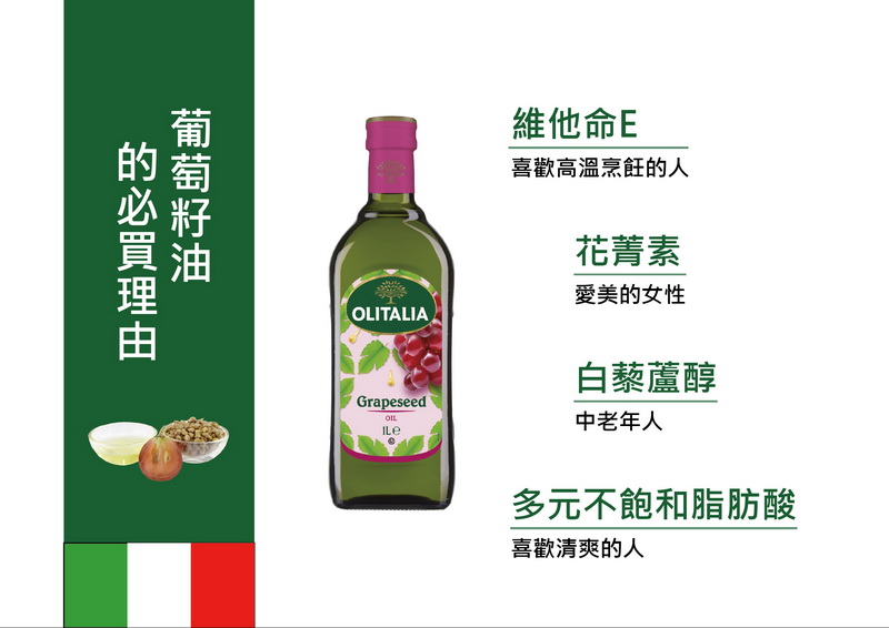 葡萄籽是最近相當熱門的食品,原因就是其中富含天然抗氧化成分「花菁素」,還有維生素 E,對於不是很喜歡橄欖油味道的人,會選擇有淡淡松子味的葡萄籽油來代替。OLITALIA 奧利塔的葡萄籽油含有 68% 的單元不飽和脂肪,發煙點高達 240 度,很適合煎、炒、炸等的料理使用。