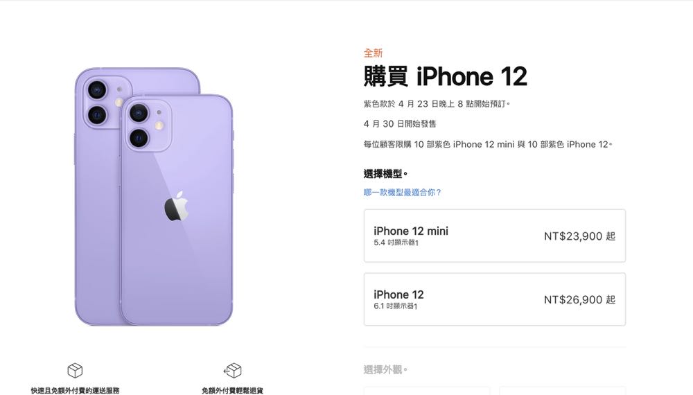 根據台灣 Apple 官網表示,新款的紫色預計 4 月 23 日晚上 8 點開始預訂,4 月 30 日開始發售,每個帳號能夠購買 10 部紫色 iPhone 12 mini 與 10 部紫色 iPhone 12。