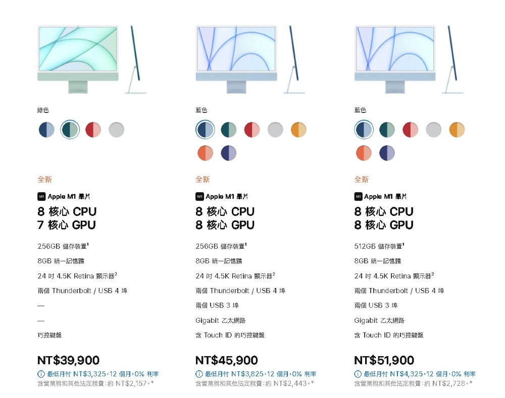 全新的 24 吋 iMac 提供三種標準規格,最低規僅能選擇 4 種配色,售價新臺幣 39,900 元起(8 核心 CPU+ 7 核心 GPU、8GB + 256GB),臺灣上市日期未定,美國將在 4 月 30 日開放預購,5 月下旬開賣。