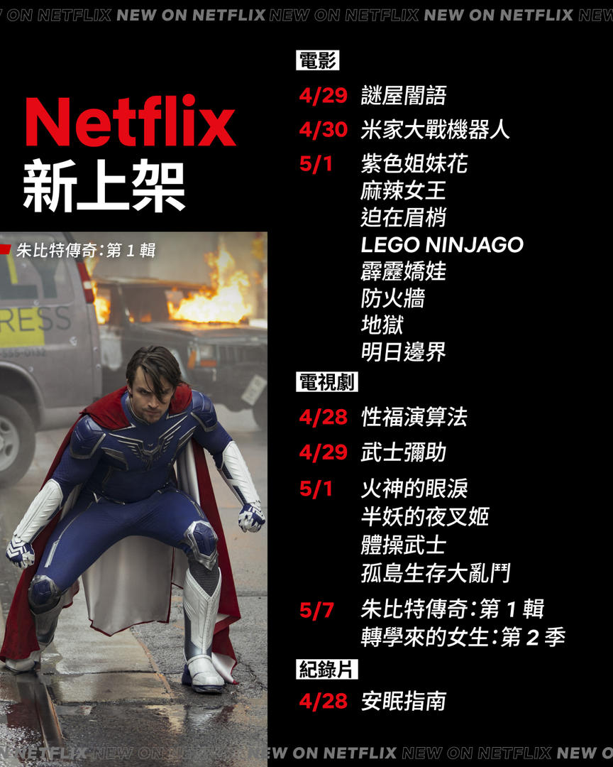當然,除了公布下即將下架的影片,Netflix 也將在 4 月 29 日起陸續帶來《火神的眼淚》、《LEGO NINJAGO》等電影、電視劇、紀錄片等新劇。