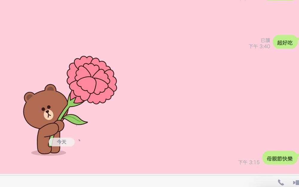 此次的特效也與往常相同,只要輸入關鍵字後,聊天室的背景就變成超療癒的粉紅色,然後特派員熊大會為媽咪獻上一朵比自己還高康乃馨,給媽咪一個大大的驚喜。