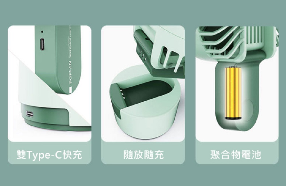 冰棒風扇貼心的提供三種供電方式,分別有雙 Type-C 快充、金屬接點隨放隨充以及聚合物電池,擺在桌上或拿在手上都能輕鬆使用。另外,內建的 1,400mAh 容量聚合物電池可提供二至四小時的電力,滿足日常生活所需。