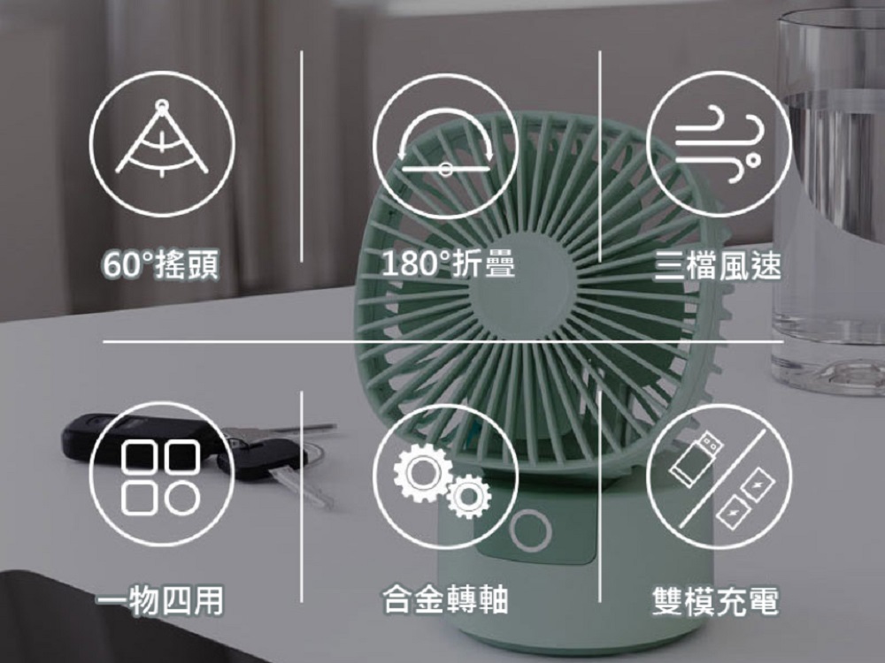 這次介紹的冰棒風扇共有六大特色,分別是具備 60 度擺頭角度、180 折疊收納、三檔風速、一物四用、合金轉軸以及雙模充電。除了上述六大特色外,它的外型與顏色也偏向文青風,共有活力綠、素簡白兩種顏色,無論哪一種顏色都非常適合擺放在辦公桌、書桌上。