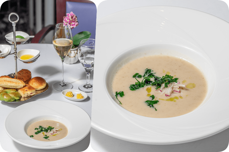 白蘿蔔濃湯裡有著強度適中的松露風味,搭配櫻桃蘿蔔的脆口度與蝦夷蔥油的迷人香氣,每一口都會給人強烈的幸福感