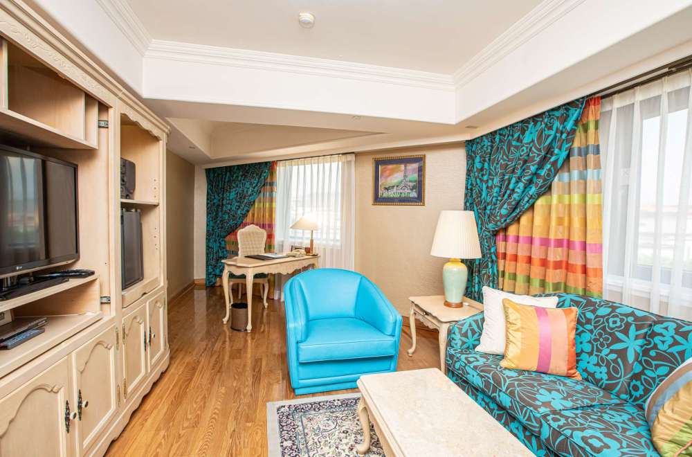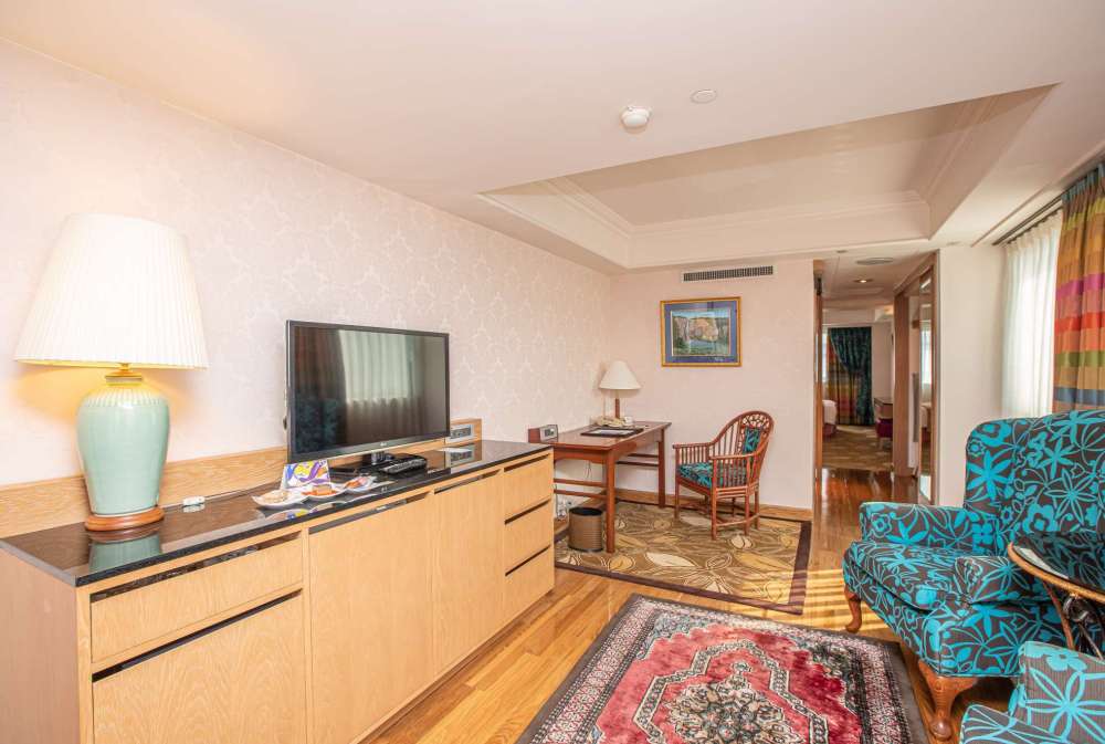 不只有兩張沙發跟一個茶几,再加上獨立的辦公桌與電視,整個空間的大小已經超過12坪,也已經是初階套房的模式