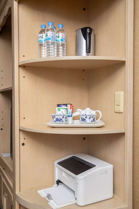 木質櫃子的轉角,還搭配了印表機跟茶具及熱水瓶,收納得相當好