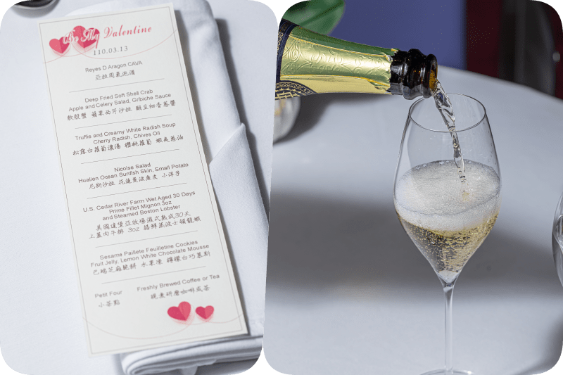 接下來,白色情人節地中海牛排館爵士情人饗夜正式開始,一開始服務人員會幫大家倒上一杯Reyes De Aragon亞拉岡氣泡酒