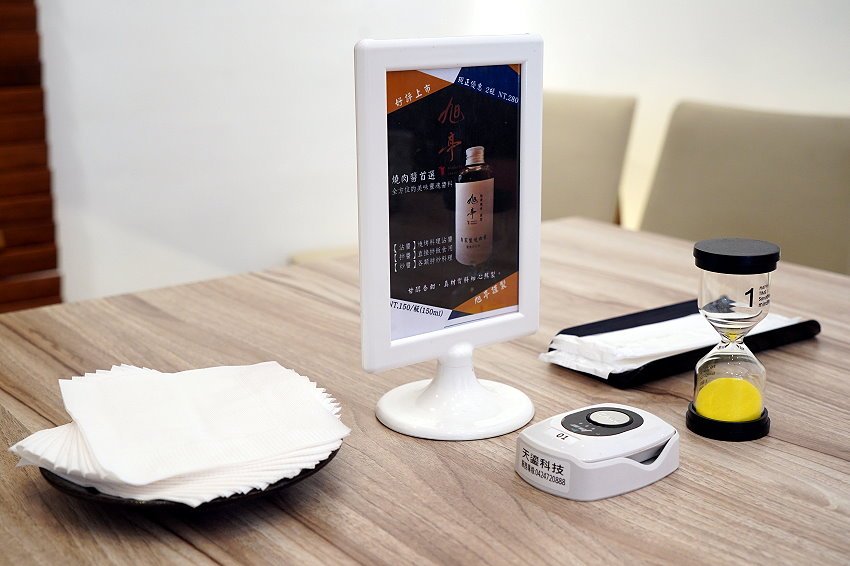 ▼桌上有燒肉醬的介紹,還有提供餐巾紙、濕紙巾、服務鈴、沙漏等,有需求的客人都可以自行取用!