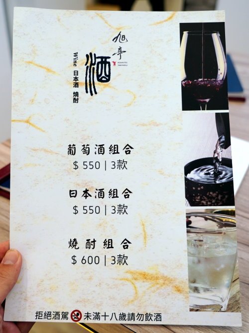 ▼如果不知道要選什麼搭餐酒的話,也可以直接選店家配好的葡萄酒、日本酒、燒酎組合,一次就能喝到三種不同的酒品,而且店家也會不定期更換酒單,也會加入近期較受歡迎的酒類,所以每次來喝到的不見得都一樣!