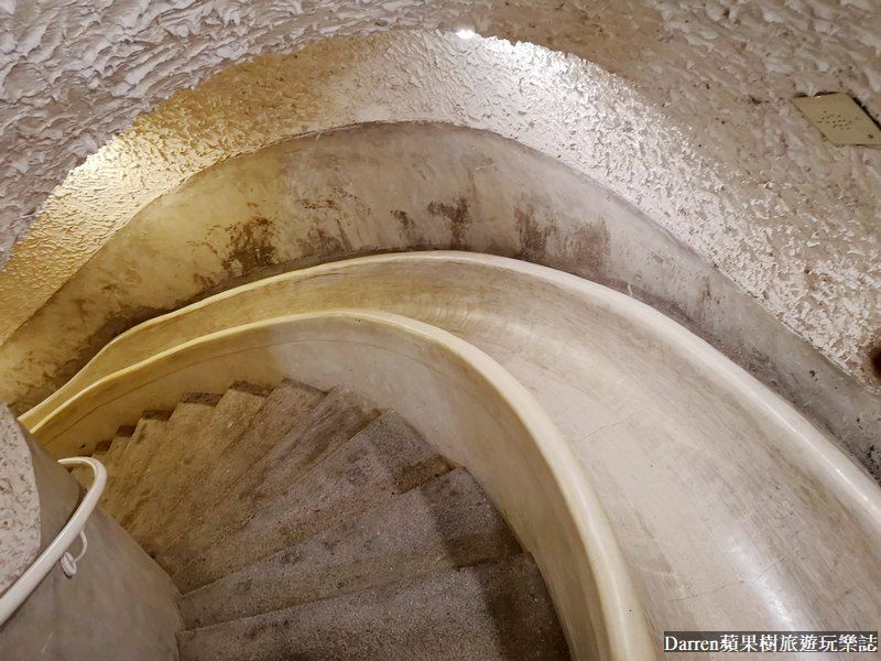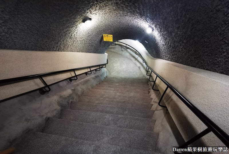 ▲▼圓山東密道介紹:東密道用鋼筋水泥興建全長67公尺、84個階梯,架設43盞防爆燈架,即使有爆裂事件,碎片也不會飛濺造成二次傷害,密道設計迂迴彎曲,是為了避開追兵和直線前進的子彈,凹凸不平牆面加強吸音效果,讓追兵不易定位,東密道通往八二三砲戰紀念公園