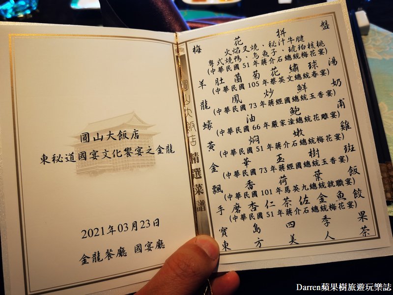 用餐菜色是金龍廳廣式菜系,圓山大飯店東密道國宴文化饗宴專案贈送個人專屬國宴菜譜,客製化餐宴名稱及菜式說明等等,另外餐具都有70年歷史,所以特別珍貴