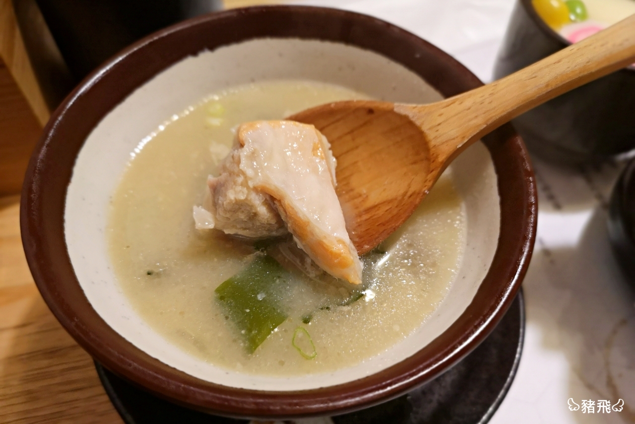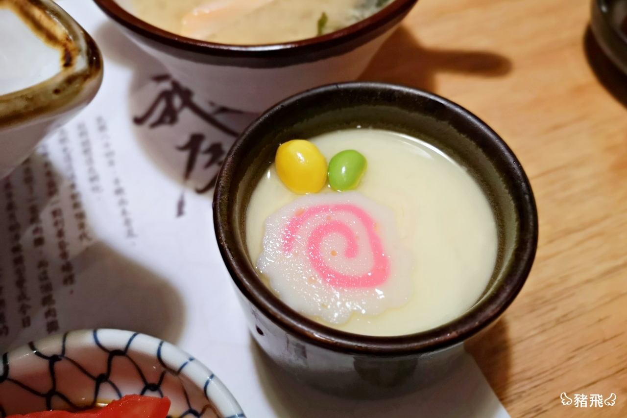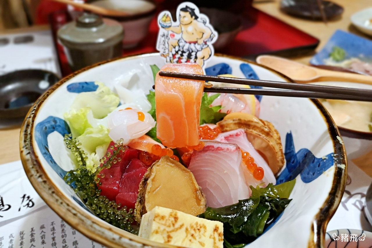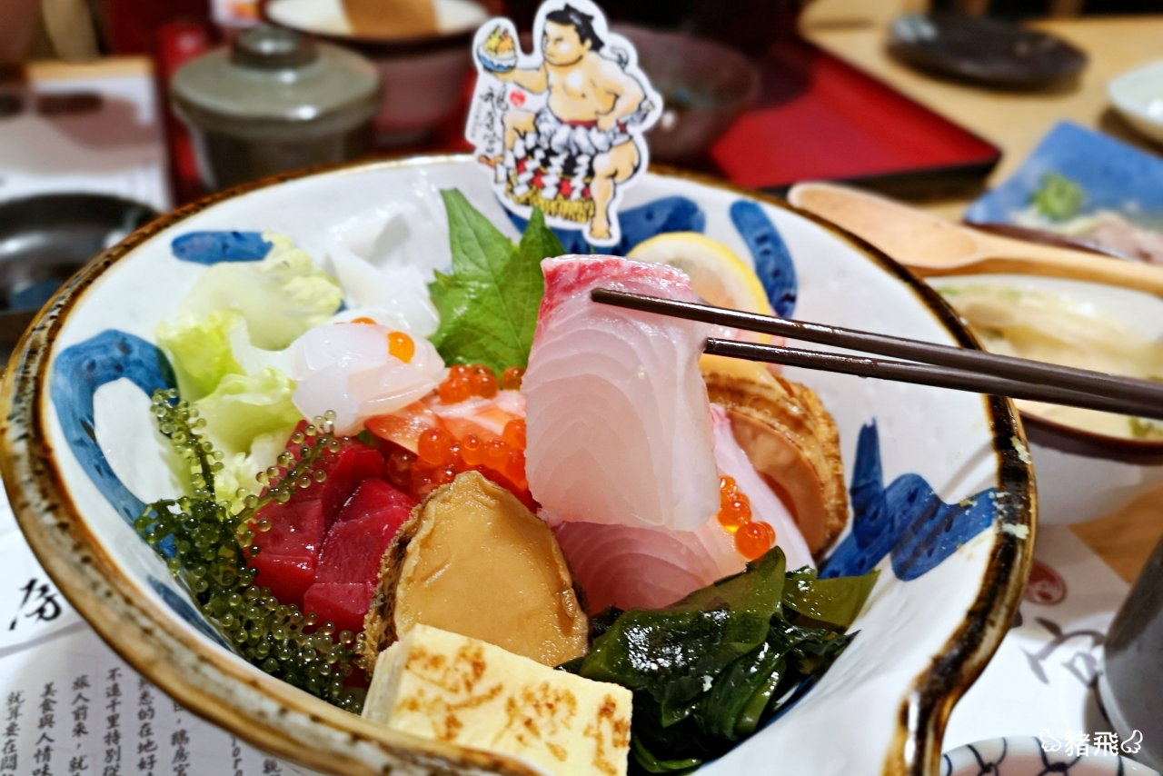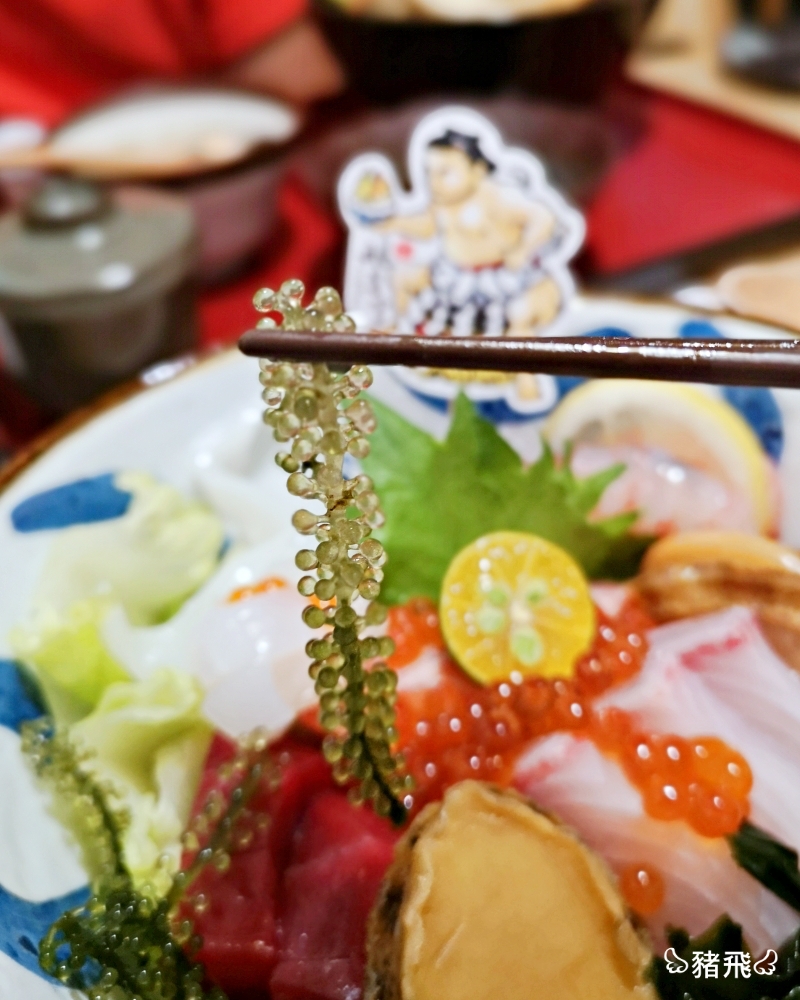 點丼飯會包含主餐、味增魚湯、蒸蛋、小菜,吃完一整套的份量連男生都覺得很飽足。相撲丼是特色餐點,如果第一次來豬飛很推薦點它,想得到的刺身都有,像是甜蝦、扇貝、鮭魚、鮪魚、旗魚、鮑魚、甜蝦、玉子燒、鮭魚卵,點綴了海葡萄、紫蘇葉,愛吃生魚片的朋友必點!新鮮度、口感都很到位。
