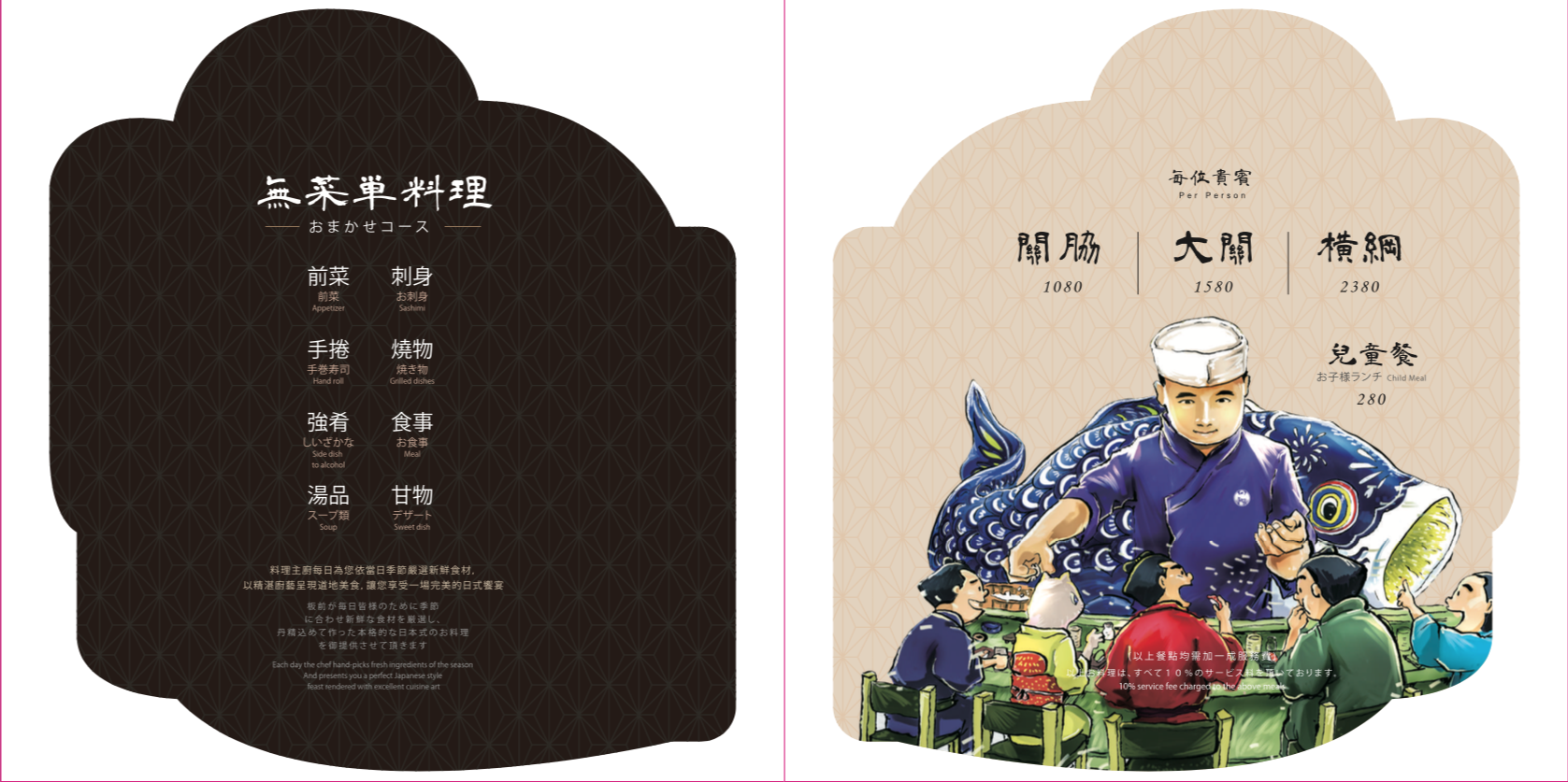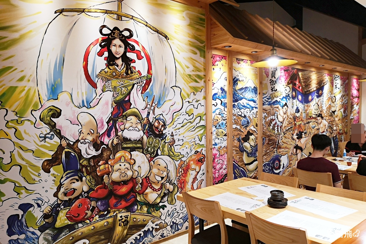 走進餐廳裡你一定會被眼前的裝潢給震攝到,『好浮誇!好霸氣!』第一次看到一字型以外的板前設計,這裡打造超大座檜木正方形板前,是炙手可熱的座位區,能一邊吃飯一邊看著師傅製作料理是種享受。牆面上的壁畫更是忍不住想要多看幾眼,活潑繽紛配色正好呈現出節氣氣氛,還有日本代表性文化的相撲彩繪。這也算得上是一處網美景點了,想要拍到空景,只能等打烊囉。