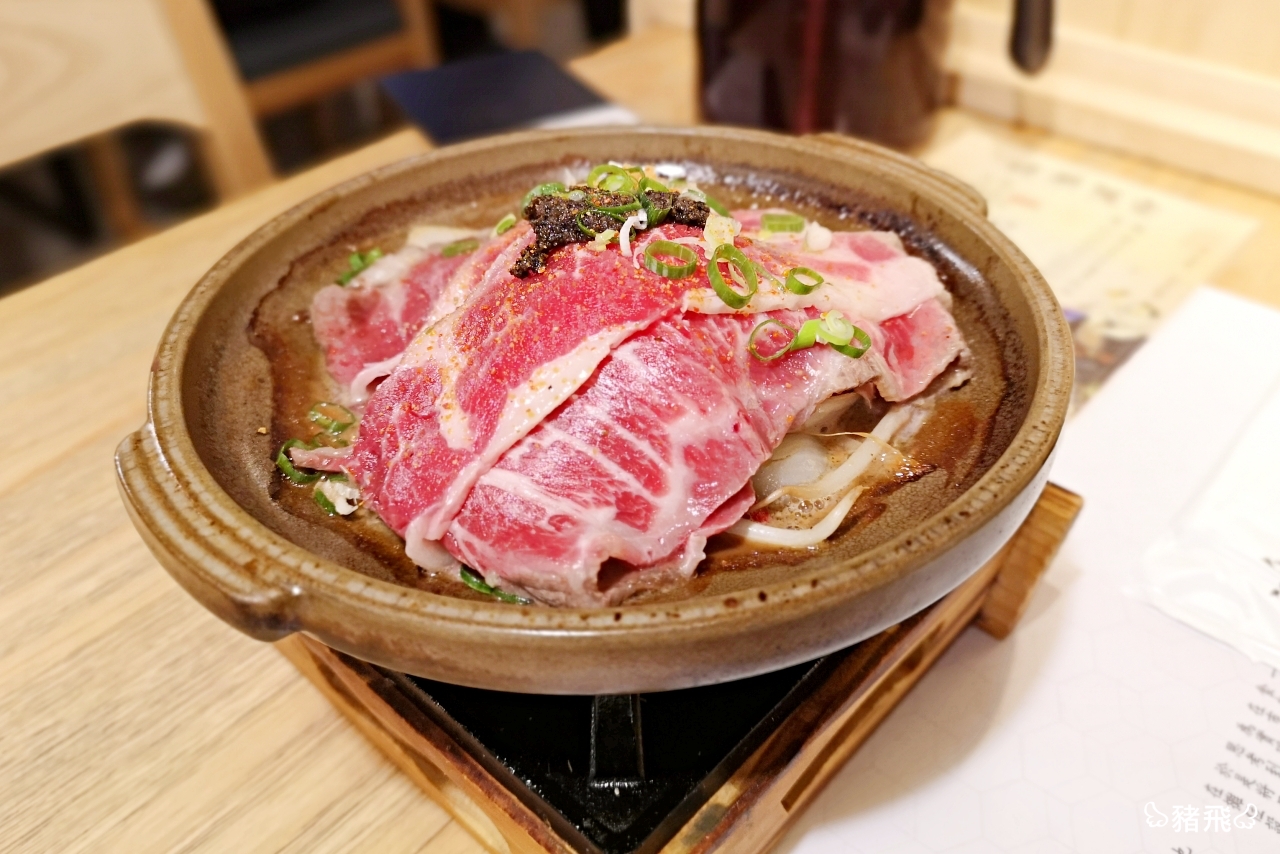 友人點的牛肉燒,上面鋪了厚度剛好的牛肉片,上頭黑黑的是松露醬,底下是蔬菜,偷吃了一片,加熱過程中肉的鮮甜已經滲透到蔬菜裡,而牛肉片卻又不會過老,口感實在軟嫩好吃。