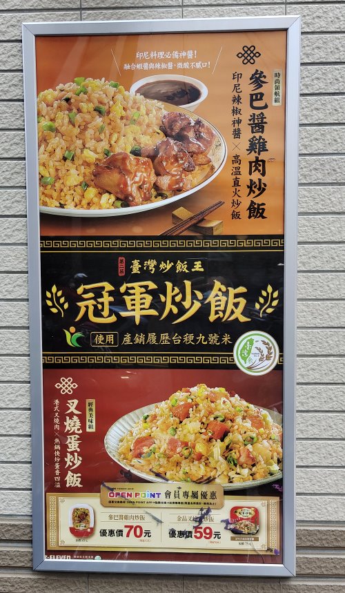 ▼超商外頭有大大的海報,看起來特別吸引人啊!這兩款冠軍炒飯都是100%採用國產的產銷履歷米「臺稉9號」所炒製而成,很適合多買幾盒放在冰箱慢慢吃~~~尤其現在還是防疫期間,對於懶得出門覓食的朋友真是一大福音!