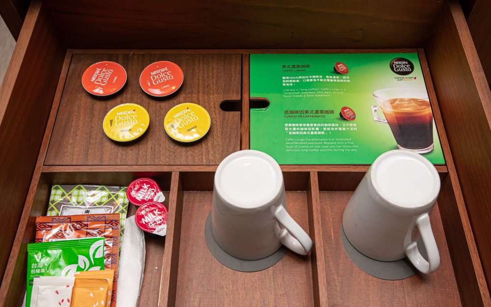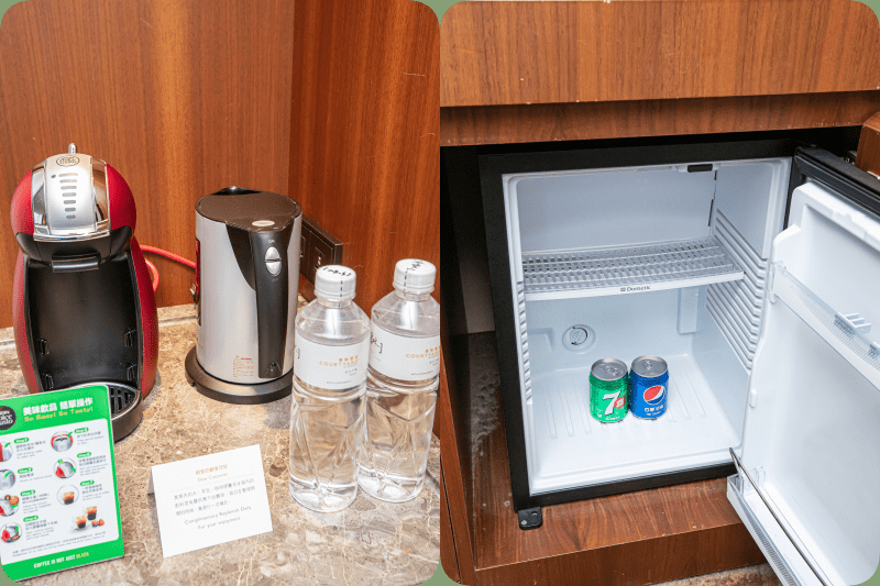 再來,六福萬怡的豪華客房裡有提供咖啡機跟四顆膠囊,茶包部分則是標準配置,冰箱裡兩瓶小瓶飲品,以上都是免費供應
