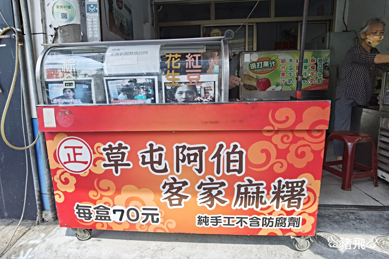 草屯隱藏版麻糬來囉!單顆7元價格實在太殺了!阿伯麻糬在網路上討論度不高,是在地人才知道的,店面不顯眼,位在中山街85度c和炸魂雞排中間的騎樓。阿伯行動比較不便,平常會坐鎮櫃台後面包麻糬,老婆在旁邊幫忙兼賣果汁。會做客家麻糬的原因,是因為老婆是客家人。