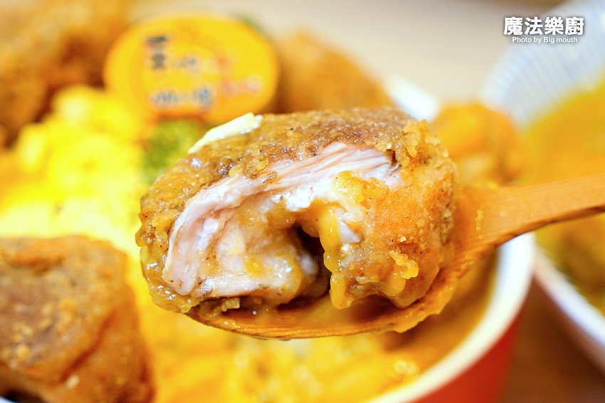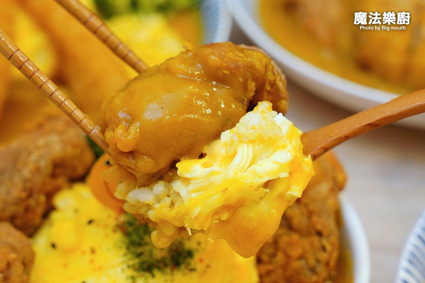 ▼一口咬下,既可以吃到鮮嫩多汁的肉質與鹹甜甘醇的微酥麵衣,飽口又美味,吃完六大塊其實就很有飽足感了,更別說還有一整碗滿滿的歐姆蛋咖哩飯,連男孩兒也能吃得非常飽!