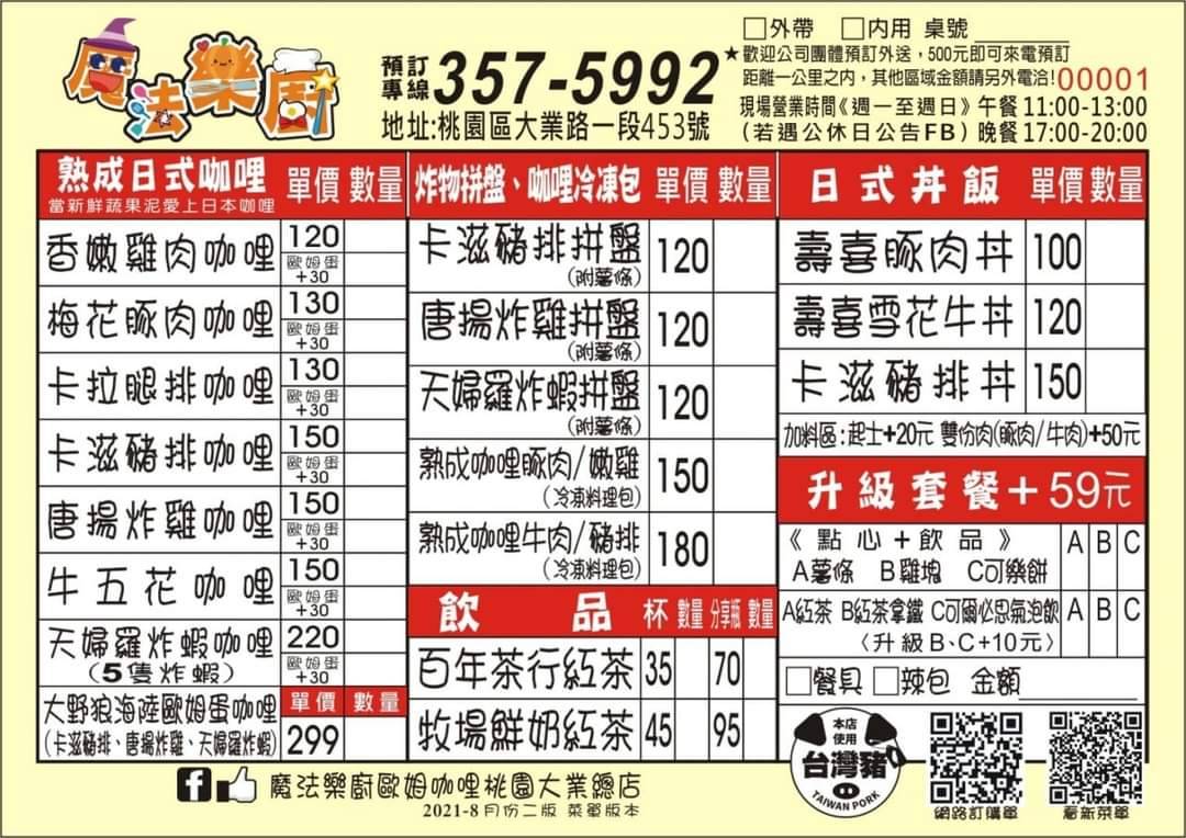▼魔法樂廚菜單,這裡有提供熟成日式咖哩、經典台式咖哩、日式丼飯、飲品等,想要升級套餐另加59元即可;此外也有提供冷凍料理包,不管是現場、網路購買都沒問題,也有不少朋友買回家慢慢享用!
