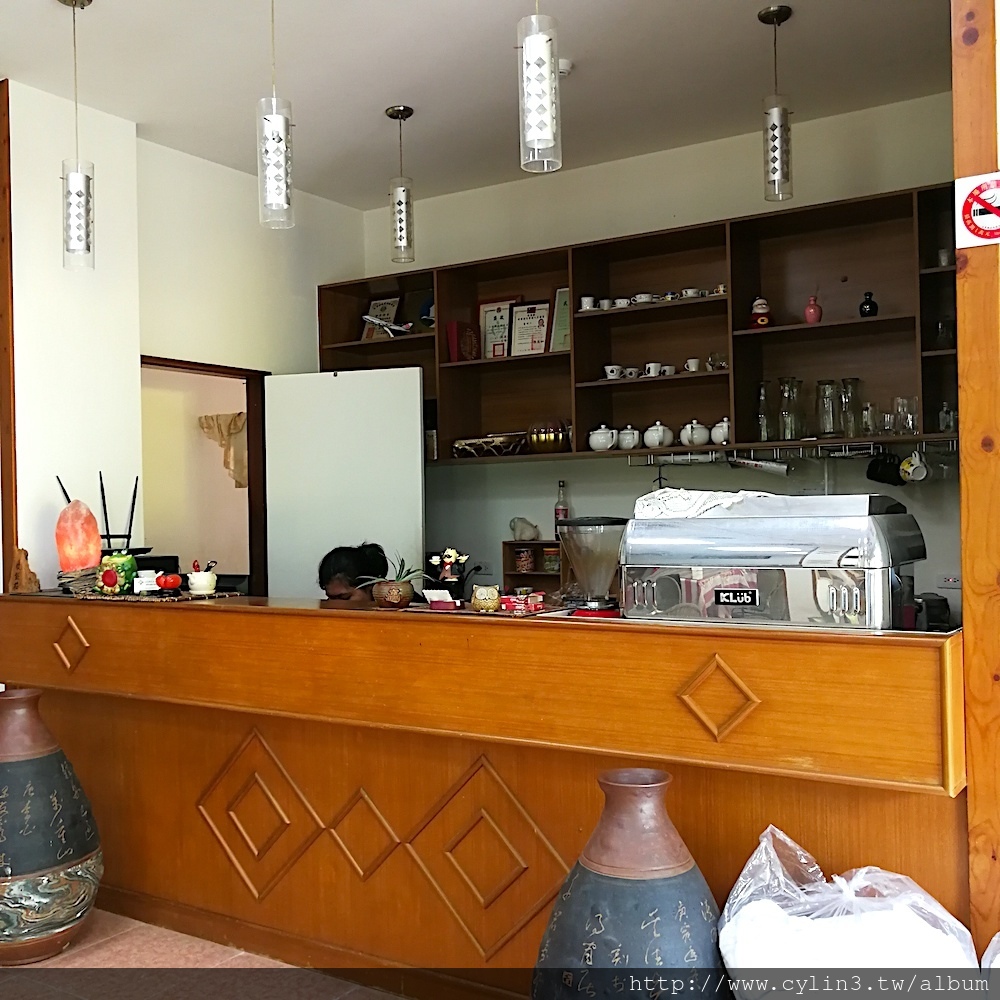 民宿一樓是公共用餐區,有不少桌椅,也有提供泡茶用具,甚至吧台區還有咖啡機可使用,也有廚房區供烹煮。