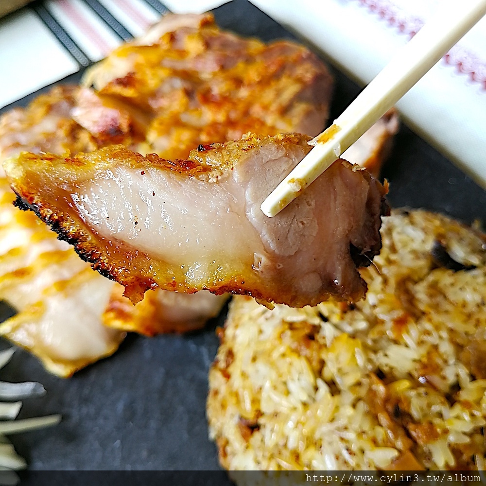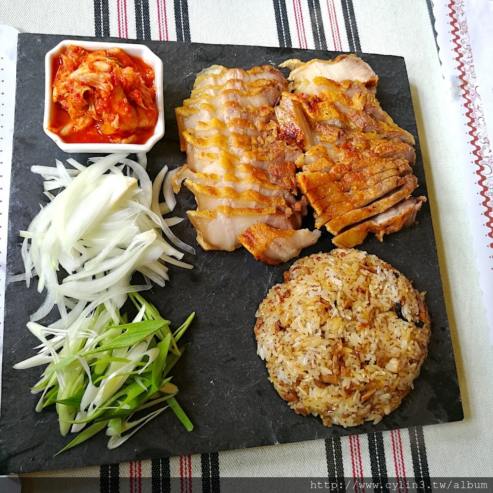 這超霸氣的大份量是大家ㄧ起食用的(約4人份),但我覺得6人一起享用都足夠,藜麥飯粒粒分明,口感有點像米糕,內餡還有香菇、豆皮絲、蝦米…,越吃越香,我還忍不住呈了兩次(羞),黃大嫂笑說他來不及準備竹筒,要不然經過竹筒悶蒸,香氣會更迷人;鹽烤豬肉部分大家讚不絕口,外皮粗脆內鮮嫩多汁,原本令人害怕的肥肉部分,經過黃大嫂厲害的廚藝,變成咬起來最香的部分啦~在個人隨口味搭配洋蔥、蒜與泡菜一起食用,過癮極了!