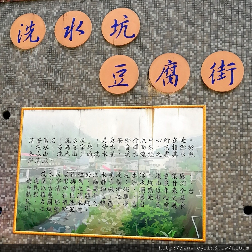 離開土牧驛健康農莊後,我們至泰安旅遊小有名氣的「洗水坑豆腐街」(清安豆腐老街)逛逛與覓食(鄰近泰安鄉公所),老街有泰雅文化與客家文化結合的感覺,有販售原住民麻糬美食、愛玉、仙草飲品,還有客家的粿、黑糖糕、料理美食…等,尤其豆腐、豆花頗負盛名。