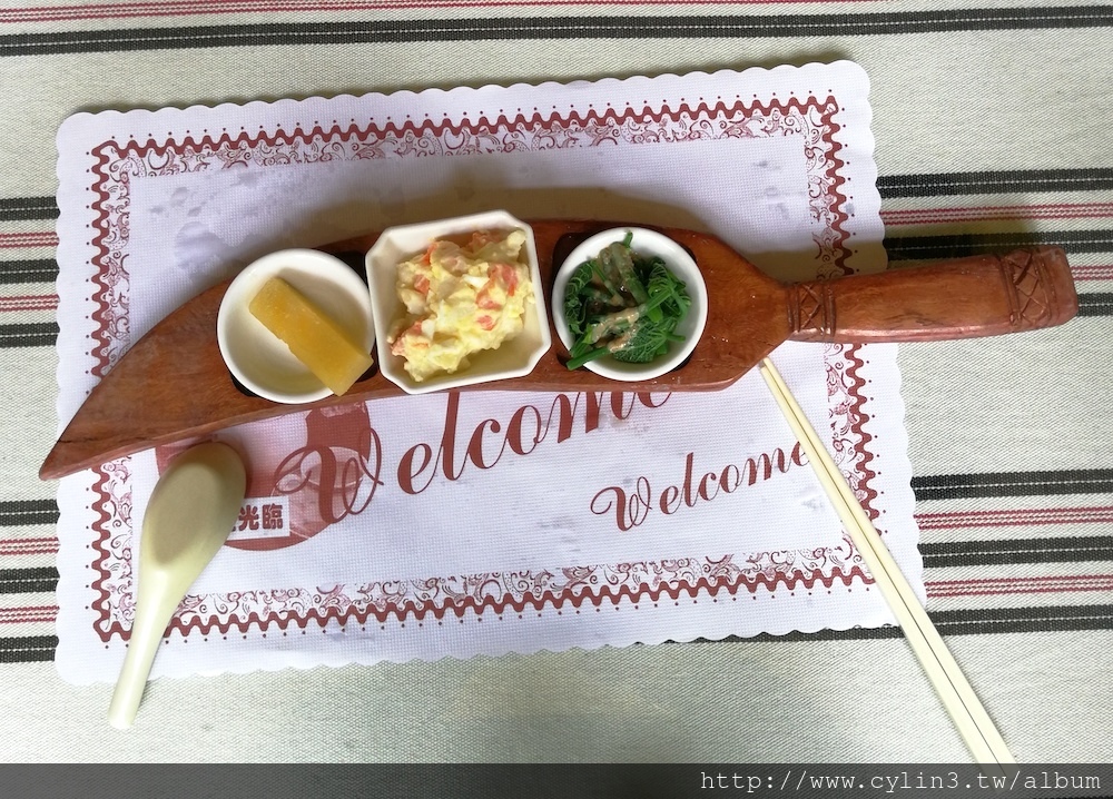 木製泰雅獵刀地盤子端出三項小巧的前菜,精美的盤子讓我忍不住詢問莊主黃大哥,是否有規範怎麼擺呢?黃大哥說無規範,但他個人建議刀鋒要對外,就像獵刀對外才能有美味食物獵取回來。