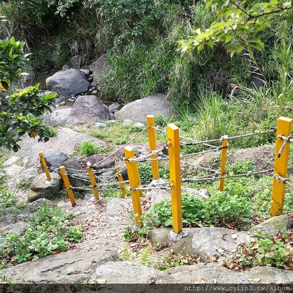 隔日一早,我們帶小朋友去麗德區順著黃色鐵杆爬著岩石而下,野溪玩玩水,看看小魚。