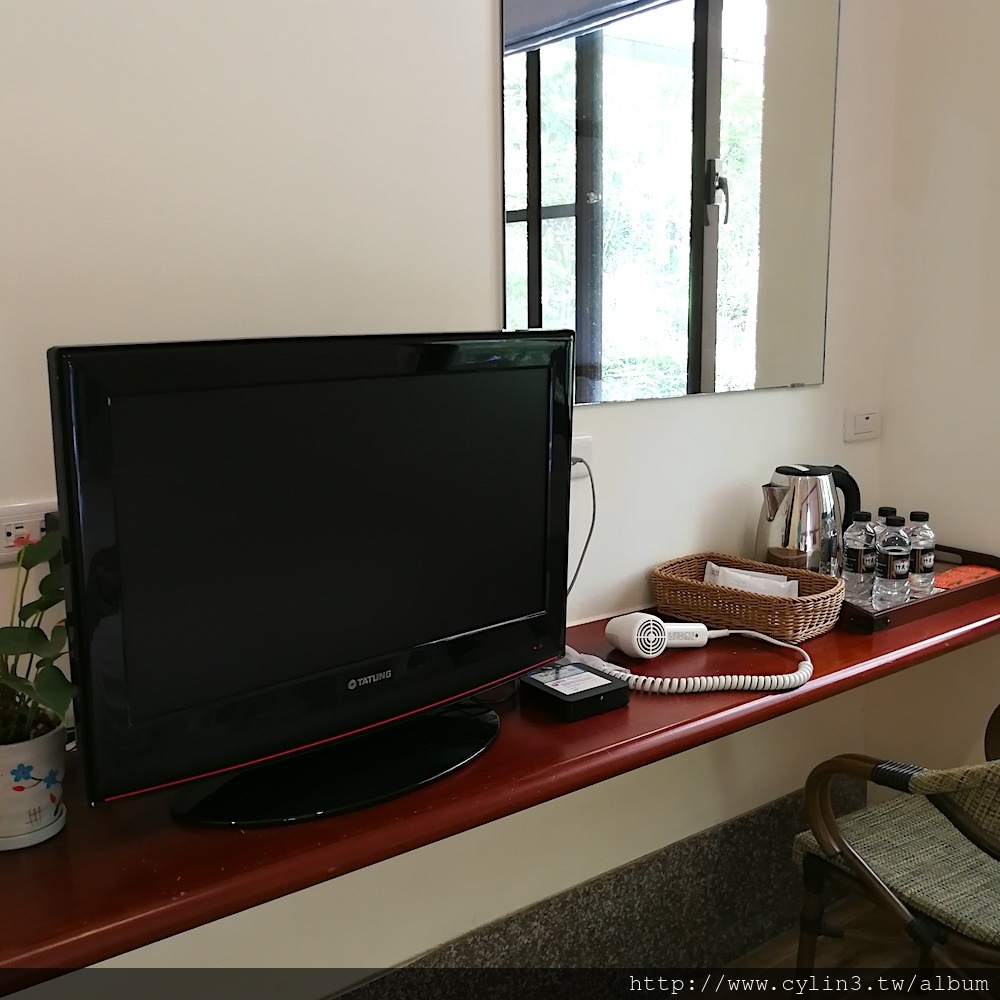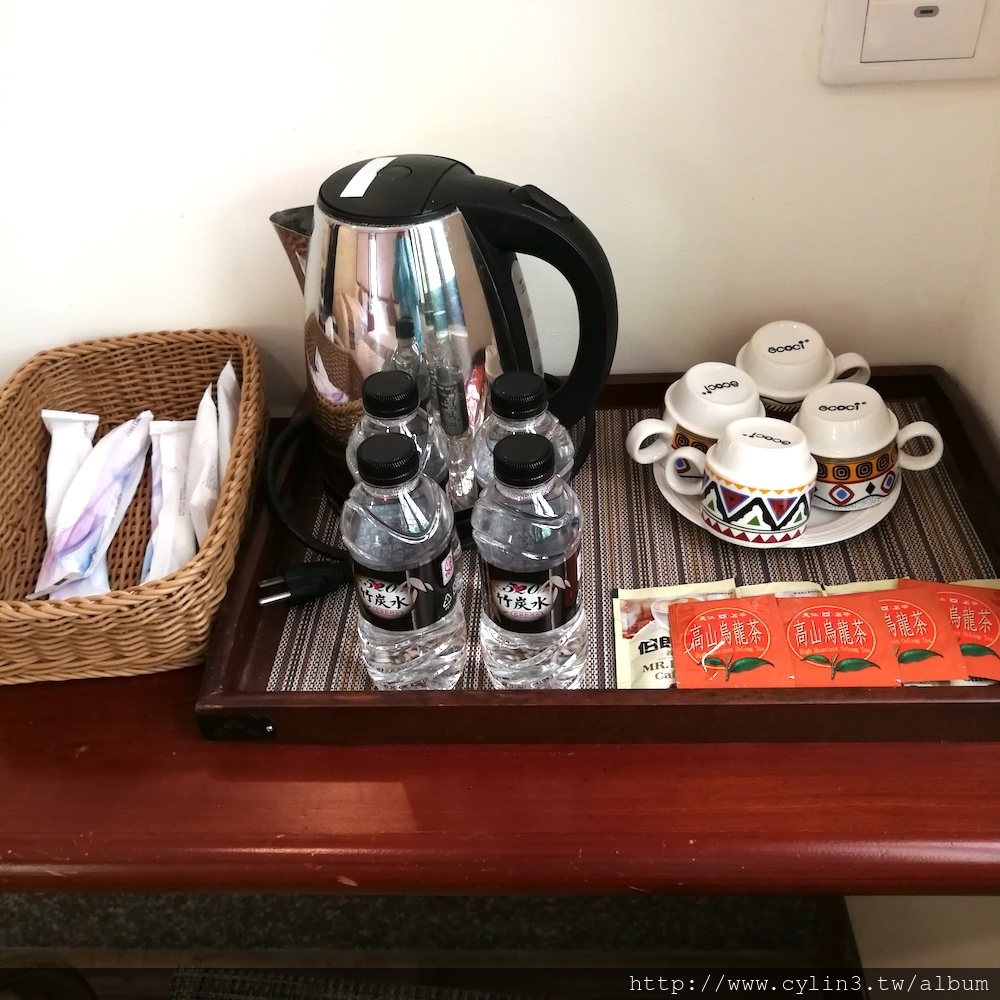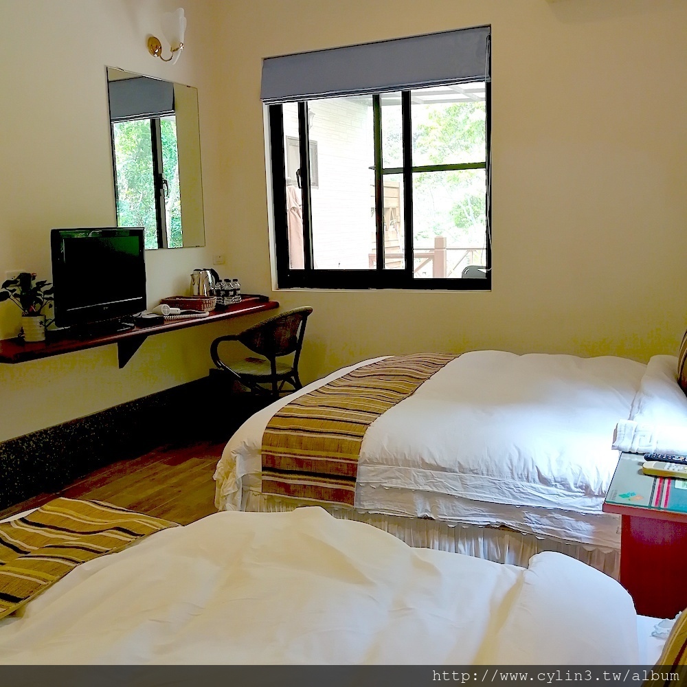 這是一樓的四人房型,房間被套與咖啡杯都很有泰雅風情,房間有對外窗,設備:電視、吹風機、熱水瓶、茶包、礦泉水與一次性盥洗用具等。