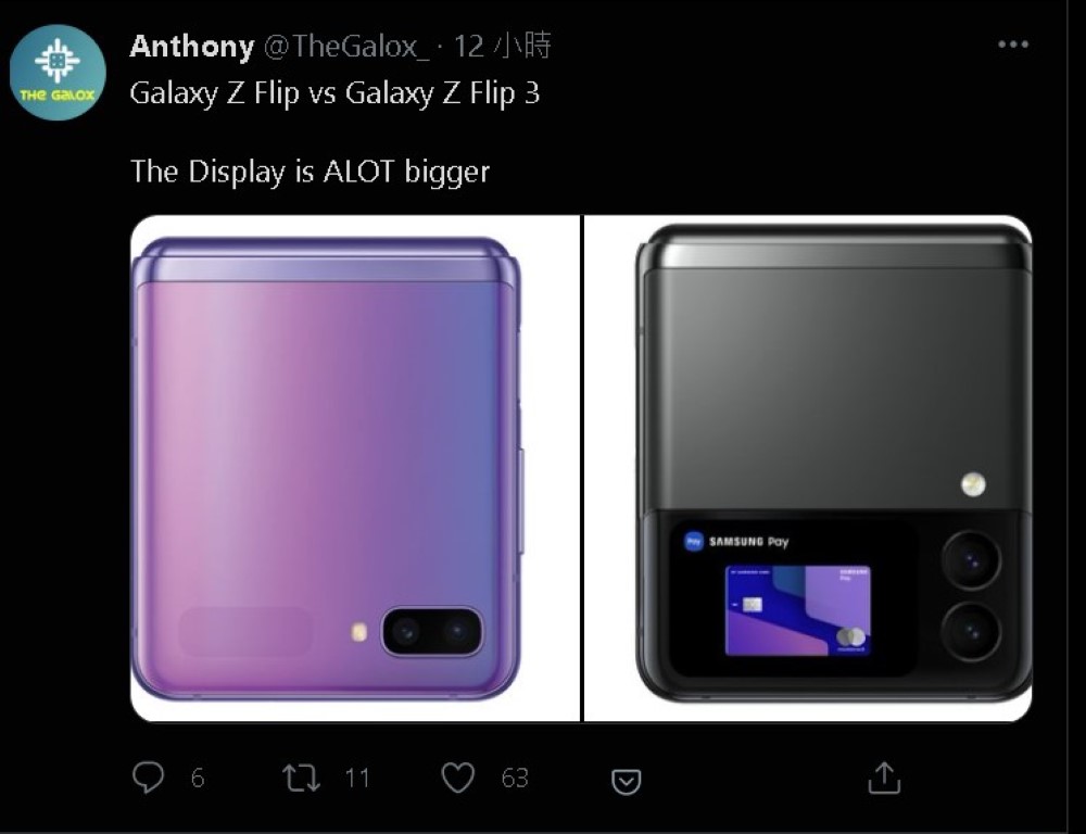 下圖是 Galaxy Z Flip、Z Flip 3 輔助顯示器的比較。