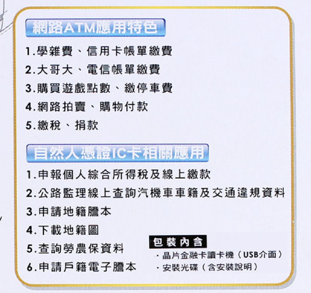 EZ100PU 多功能 ATM 晶片讀卡機可讀取多種卡片,IC 晶片金融卡、自然人憑證 IC 卡、健保 IC 卡、多種儲值 IC 卡、企業聯名卡或手機 SIM 卡都能讀取,且支援 Windows 10 與 macOS 兩種平台,不管是報稅還是繳費都非常好用。