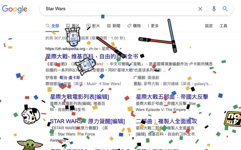 原來 Google 也在其搜尋引擎上悄悄的設置了彩蛋,只要輸入 Star Wars 或 lightsaber (光劍),畫面上就會掉下多款星際大戰的經典圖案,如光劍、Star Wars 圖示、R2、白兵等以及彩色繽紛的碎紙花,網頁瞬間變的熱鬧極了。