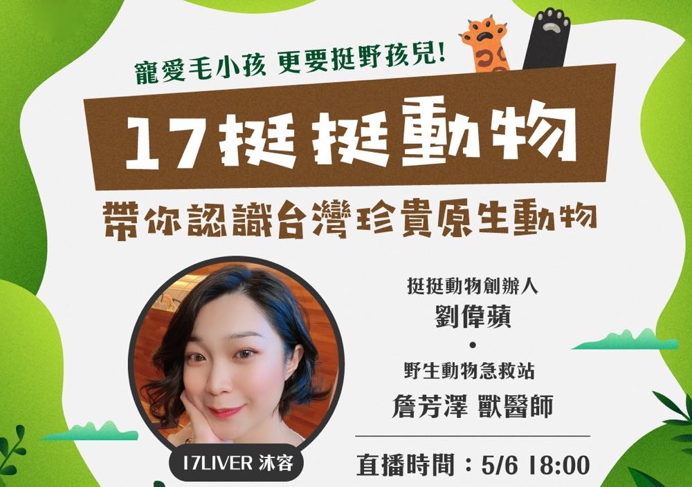 為長期投入動物保護議題關注,17LIVE 開創全新頻道「17 X 挺挺動物」,未來將不定期舉辦動物保護線上直播,由挺挺動物創辦人擔任與談人,每集將邀請台灣各種不同動物保育協會以生活化、線上即時互動的形式,帶領用戶了解更多台灣原生物種。結合保育貨櫃藝術展,「17 X 挺挺動物」頻道於 5/6(四)晚上 6 點首播,由 17LIVE 長期投身公益與關注浪浪議題的 17LIVER -沐容,與「挺挺動物」創辦人劉偉蘋、野生動物急救站獸醫師詹芳澤,一同探討野生動物保護、野生動物急救站的工作以及保育藝術貨櫃展「落難野孩兒與牠們的守護者」的策展理念,歡迎大家準時收看!